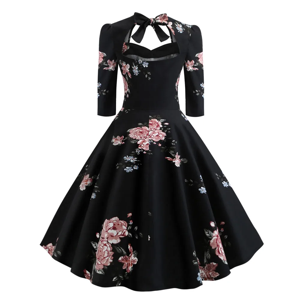 Flash Sale ROSEGAL Plus Size Floral Print Back Tie Pin Up Dress 2019 Winter Elegant Party Dresses Fit Flare Vi